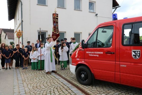 Mit Fahnenabordnungen der benachbarten Feuerwehren aus Altmannstein, Hagenhill, Hexenagger und Laimerstadt formierte sich mit der Jubelwehr am Samstagnachmittag, 1.Juli 2017, ein farbenfroher Festzug zur Pfarrkirche St. Bartholomäus. Im Mittelpunkt der Feierlichkeiten stand die Weihe des neuen Tragkraftspritzenfahrzeugs der Ortsfeuerwehr. Die nagelneue „Metzgerhalle“ wurden von engagierten Floriansjüngern in den letzten Tagen regelrecht herausgeputzt und erstrahlte im Festglanz. In der Halle untergebracht waren die aus dem Jahr 1899 stammende alte Feuerwehrspritze und der neu konzipierte Tragkraftspritzenanhänger TSA. Nach der Weihe wurde das neue TSF eingestellt und konnte von allen Interessierten begutachtet werden.