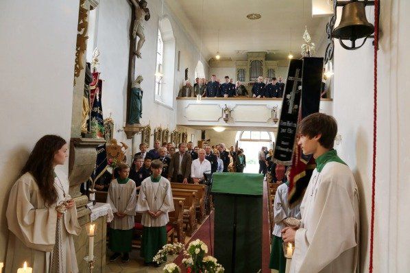 An der Spitze des Festzugs marschierten Feuerwehrchef Stefan Schmailzl und 1. Kommandant Bernhard Eberl, gefolgt von der Schambachtaler Blaskapelle unter Leitung von Hans Kuffer. Fahnenjunker Benedikt Hegenberger trug die vereinseigene Feuerwehrfahne, gefolgt von zahlreichen Floriansjüngern der 235 Mitglieder starken Ortsfeuerwehr. Neben Altmannsteins Bürgermeister Norbert Hummel marschierten auch zahlreiche Marktgemeinderäte, Kreisbrandinspektor Franz Waltl (Pförring) und Pfarrer Wolfgang Stowasser im Festzug mit. Danach folgten die Fahnenabordnungen der benachbarten Feuerwehren aus Altmannstein, Hagenhill, Hexenagger und Laimerstadt. Der gut 150 Mitwirkende starke Festzug schlängelte sich durch die Dorfstraßen zur Pfarrkirche St. Bartholomäus. Pfarrer Stowasser freute sich sehr über die rege Beteiligung und das volle Gotteshaus.