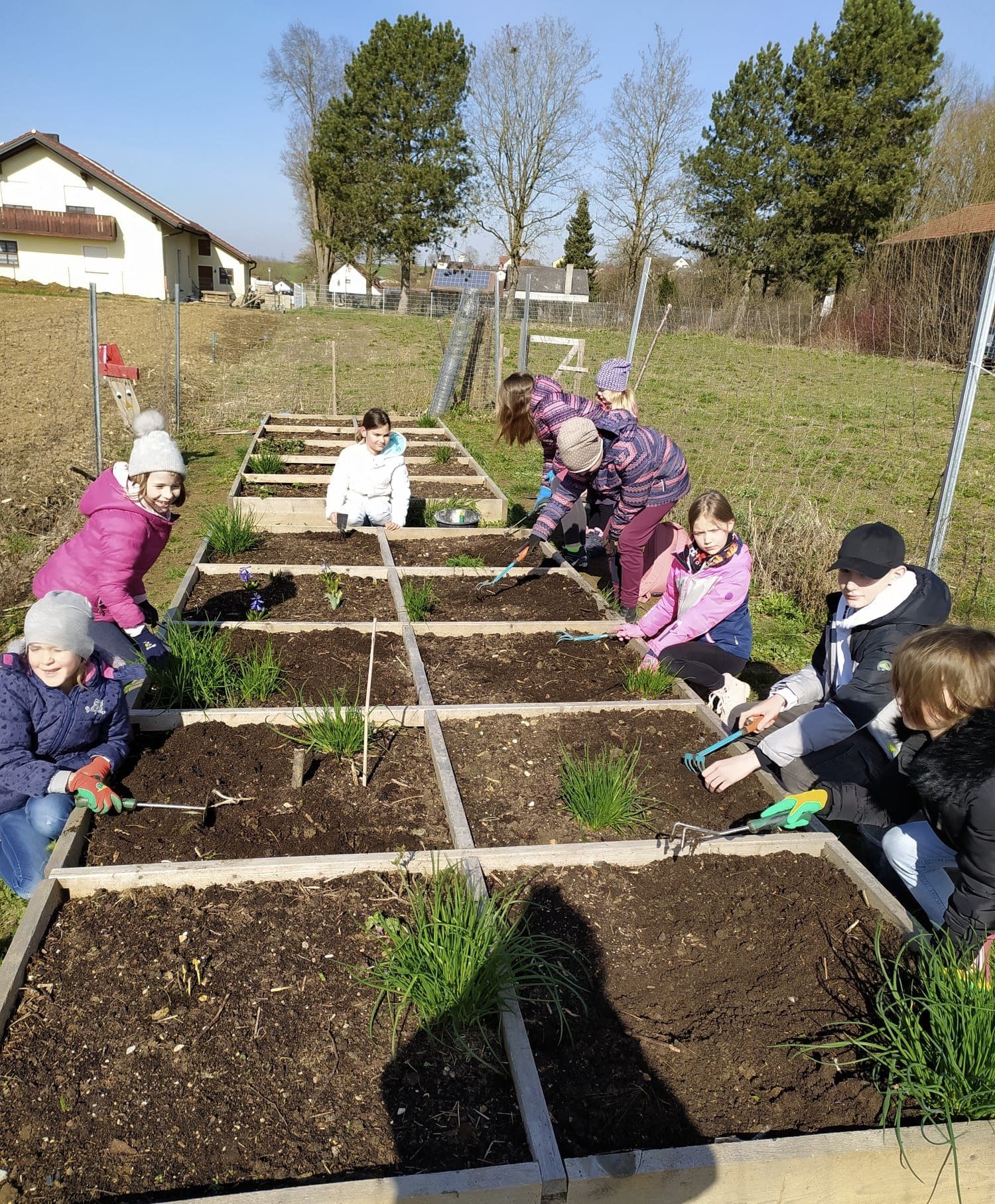 „Die Kindern haben verschiedene Gemüsesorten gepflanzt, wie z.B. Kohlrabi, Salat und Zwiebel – aber auch verschiedene Sommerblumen“, erzählt Irene Feigl. Die Beete, die zur einfacheren Bearbeitung bis zu einem Meter Seitenlänge aufweisen, wurden mit Holzlatten in Quadrate von 80 mal 80 Zentimetern Länge unterteilt. In ein solches Grundquadrat passen letztlich Salat, Radieschen, Paprika, Gurken, Buschbohnen und nach den Eisheiligen auch Tomaten. Gemeinsam werden die Kinder das Unkraut jäten, bei Trockenheit Gießen und die Pflanzen regelmäßig „betüteln“
