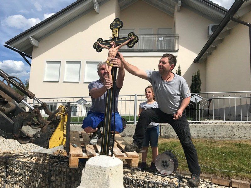 20.Juni 1912, um ½ 9 Uhr früh, beim Gänsehüten auf den Feldern in der Nähe des „Fußwassers“ durch Blitzschlag getötet“. „Mittlerweile zum dritten Mal musste das Holzkreuz aufgrund Verwitterung in den letzten Jahrzehnten erneuert werden“, erzählt Zimmerer Michael Eberl. Zuletzt am 28.August 1982 – davon zeugt die Inschrift in der von Eleonore Kloiber (Altmannstein) gemalten Votivtafel. Vor der Flurbereinigung im Jahr 1965 stand das Marterl am Feldrand beim „Fußwasser“, welches jedoch in diesem Zuge aufgeschüttet wurde. 1982 ließ Land- und Gastwirt Michael Forster das Marterl im Flurbereich „Hölle“ kurz vor der Ortsgrenze zum Nachbardorf Laimerstadt umsiedeln. „Nach Erzählungen hat die Barbara Angerer bei uns am Hof die Gänse gehütet“, erinnert sich Land- und Gastwirt Michael Forster. In Zusammenarbeit mit dem Lüftlmaler Wolfgang Koch und seinem Onkel, dem Zimmerer Michael Eberl, ließ er in den letzten Wochen das neue Marterl aus Eichenholz errichten. „Das Eichenholz ist seit über 20 Jahren abgelagert und ideal dafür geeignet“, schildert der 80jährige Michael Eberl, der bei seiner Arbeit von seinem Neffen Reinhard Eberl tatkräftig unterstützt wurde. Als Schutz vor Verwitterung dient ein Kupferblech, angefertigt von Schmiedemeister Norbert Huber aus Hexenagger. Mit einem Gedenkgottesdienst, zelebriert von Pfarrer Wolfgang Stowasser, erinnern die Pfarrangehörigen am Mittwochabend um 19 Uhr an den tragischen Tod der 13jährigen Barbara Angerer. Bei verschiedenen Anlässen, wie z.B. beim Emmausgang oder bei der Flurprozession oder einfach als Ziel von Wanderungen, ist das „Gänseliesel-Marterl“ gerngesehene Anlaufstelle. Im Anschluss an die Eucharistiefeier im Freien lädt der Pfarrgemeinderat zu einem gemütlichen Beisammensein mit Umtrunk ein. Bei schlechter Witterung findet der Gottesdienst in der Pfarrkirche St.Bartholomäus statt. Schließlich trohnt das bereits bestehend Eisenkreuz auf dem