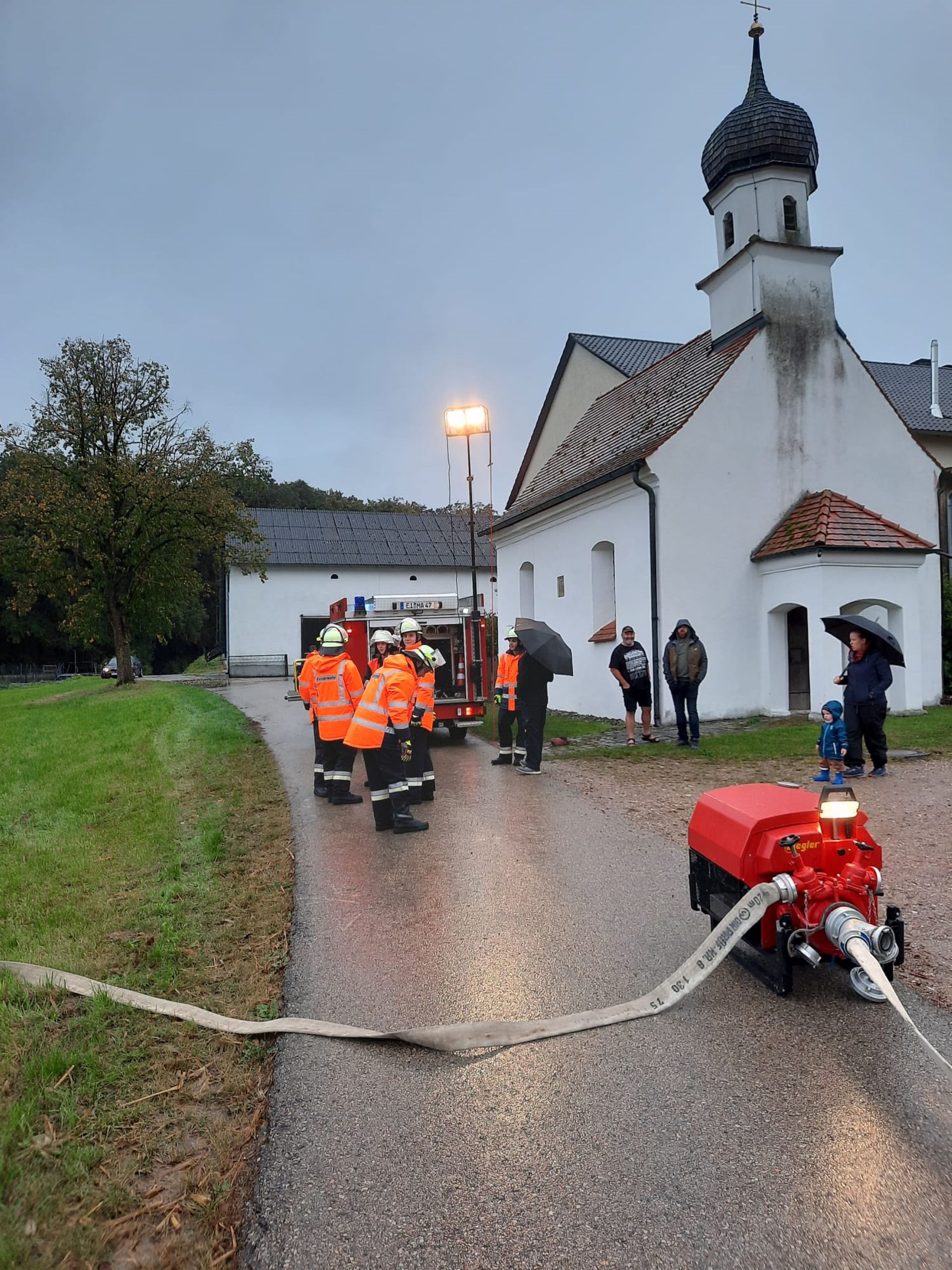 Die Idee zu dieser Gemeinschaftsübung hatten die beiden Kommandanten-Stellvertreter Alexander Moser (Tettenwang) und Tobias Schwarzmeier (Hagenhill). Schlag auf Schlag gingen die Wehren am Einsatzort gezielt vor. Unter Leitung von Kommandant Stefan Nigl übernahm die Laimerstädter Wehr den Aufbau der Schlauchleitung und das Ansaugen des benötigten Wassers aus der Schambach. Die Einsatzkräfte der Feuerwehr Hagenhill, welche von Gruppenführer Phillip Bayer befehligt wurden, übernahm mit ihrem Logistikwagen das Auslegen der Schlauchleitung mit B-Schläuchen bis zum Weiler Sauhof. Zusätzlich war auf halber Strecke die Hagenhiller Tragkraftspritze zwischengeschalten, um das Wasser schneller den Berg hinauf zu treiben. Sehr hilfreich war bei der Abendübung die Beleuchtung durch die Laimerstädter Wehr. Direkt am Brandherd wirkten die Floriansjünger der Tettenwanger Feuerwehr. Unter dem Kommando von Vize-Kommandant Alexander Moser bauten die Floriansjünger die Pumpe auf und legten mit einer B-Länge den Verteiler, von dem aus drei C-Strahlrohre versorgt wurden. Bald darauf ertönte via Funk das Kommando des Einsatzleiters Simon Hecker: Wasser marsch! Die FFW Laimerstadt ließ die Saugleitung zu Wasser, Hagenhill leitete in der B-Leitung das Löschwasser mittels Pumpe weiter zum Brandherd, wo die Tettenwang Floriansjünger mit dem Löschen des Brandherdes begannen. Aus Rücksicht auf die Gebäude am Sauhof spritzen die Wehrmänner Richtung Wiese. Zusätzlich zum Schambachwasser wurde auch der am Weiler Althexenagger bestehende Überflurhydrant genutzt. „Die Praxis bestätigt die Theorie, denn die drei zehn Bar-Pumpen hatten keine Mühe, das Wasser zum Ziel zu fördern“, war der Einsatzleiter sichtlich erleichtert und bestätigt. Aus allen drei Strahlrohren kam genügend Löschwasser. Im Grund reichten bei dem Einsatz zwei Tragkraftspritzen. Sollte allerdings eine Drehleiter für die brennenden Gebäude benötigt werden und das Wasser somit noch höher gepumpt werden, wird die dritte Pumpe definitiv benötigt. Nach ein paar Minuten durchgehender Versorgung beendete Kommandant Simon Hecker die Übung und blies zum gemeinsamen Abbau.