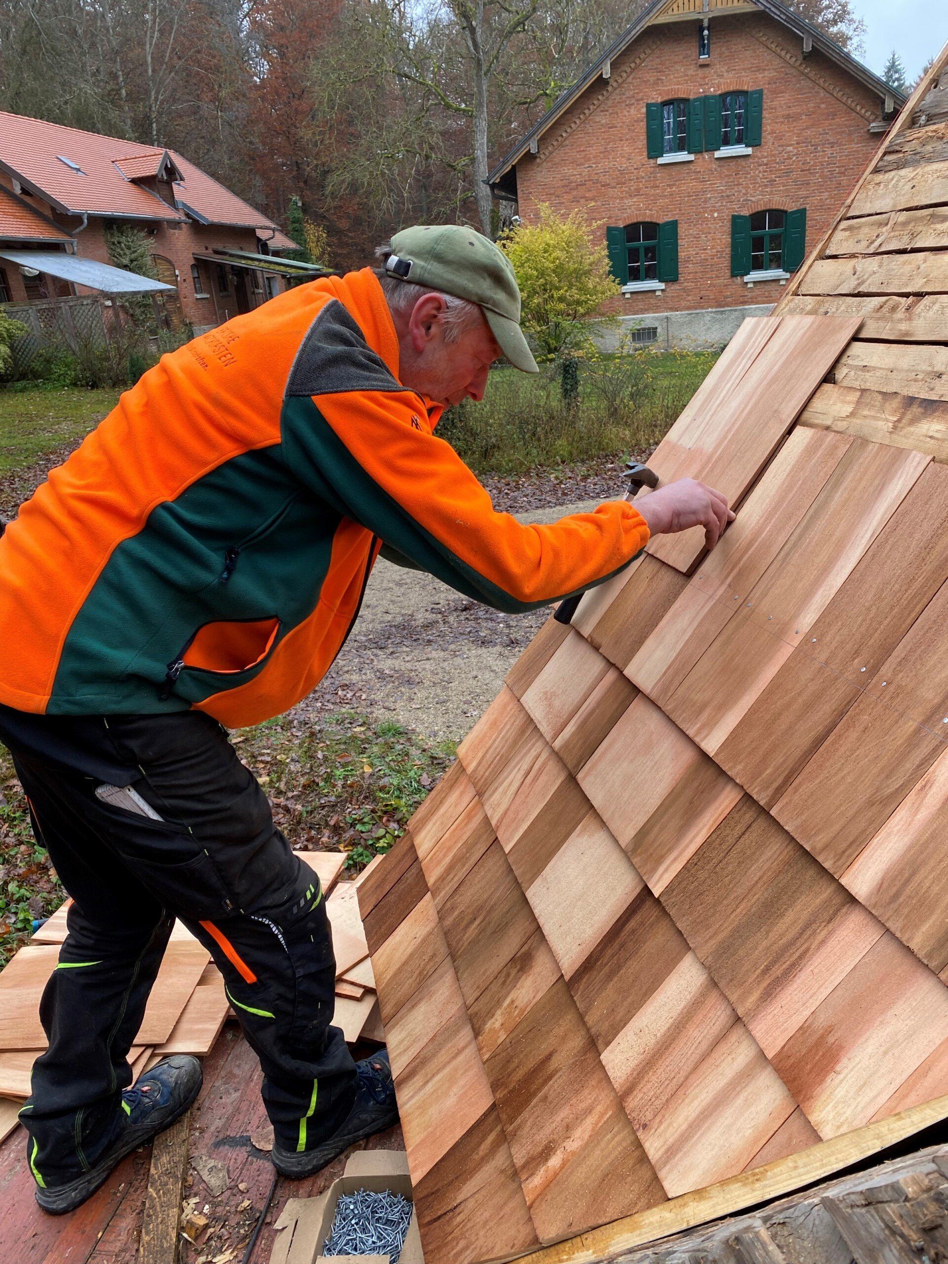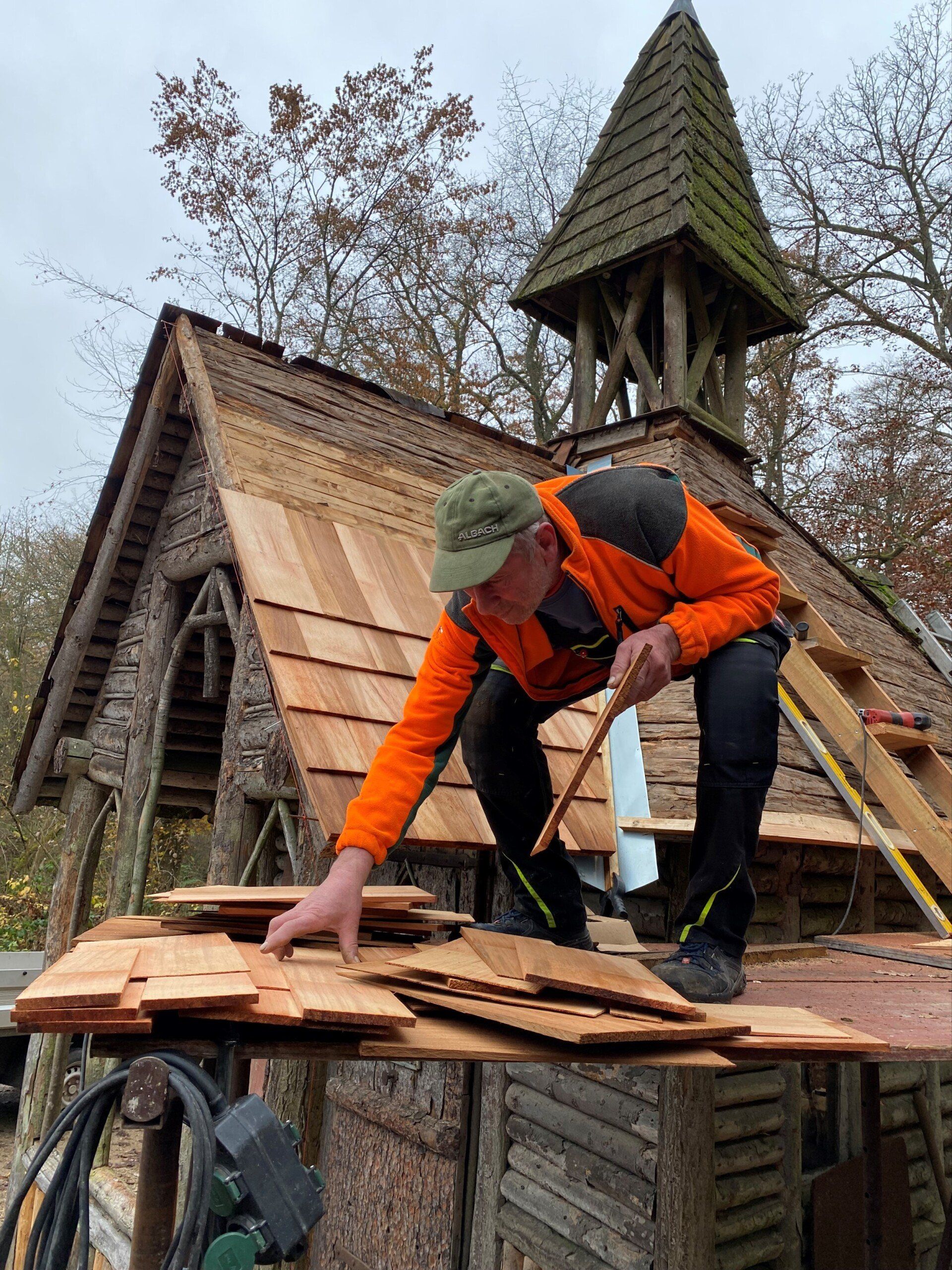 „Mit verschiedenen Hölzern wurde die Kapelle 1904 erbaut und vor rund einem halben Jahrhundert zwischenzeitlich renoviert“, beschreibt Günther Ferstl den Bauzustand. In mühevoller detaillierter Feinarbeit hat Ferstl die komplette Holzkapelle mittels Hydraulikheber dreißig Zentimeter vom nassen Erdboden angehoben. Anschließend fügte der 55jährige schwere Eichenbohlen als Fundament ein, worauf die Holzkapelle nun wetterfest steht. Zu damaligen Zeit wurden – soweit vorrätig – Eichen- und Buchenhölzer verwendet, das Dach teilweise beim ersten Mal mit Baumrinden, bei der Renovierung vor etwa fünfzig Jahren mit Lärchenschindeln gedeckt, da dies deutlich länger haltbarer und wetterbeständiger als Fichte oder Kiefer ist. „Damit die Haltbarkeit noch wesentlich länger ist, verwenden wir dieses Mal kanadische Zeder“, schildert der 55jährige Forstwirt. Die mächtigen Zedernbäume wachsen im Westen Kanadas in British Columbia, einem sehr waldreichen Gebiet. Über einen Importeur bezog der Forstbetrieb die fertigen Holzschindeln aus gelben wie rötlichen Zeder-Holz. In großen, sog. Schindelmühlen, werden die qualitätszertifizierten Schindeln hergestellt, verpackt und zusammen mit einem Beipackzettel als verlässlichen Hinweis auf Qualität und Dimension (Certi-Label) nach Europa verschifft. Die „Western Red Cedar“ besticht durch die Fäulnisresistenz und hoher Wetterfestigkeit. Die Zeder wächst sehr langsam und deshalb macht es das Holz so enorm wertvoll. Anders als bei unseren heimischen Fichten, Tannen, Kiefern und Lärchen findet man in der Zeder kein Harz, sondern Öle im Gemisch mit Gerbsäure. Anfangs duften diese ätherischen Öle noch stark und wirken Insekten abweisend. Weltweit bekannt ist die Rot–Zeder wegen ihres fäulnisstabilen Holzes. Die sauren Inhaltsstoffe verlangen jedoch eine höhere Rostbeständigkeit bei den Befestigungsmitteln wie bei Metallanschlüssen z.B. Bleche. Die Bearbeitung des Holzes als auch die Befestigung durch 6000 verzinkten Nägel ist problemlos. „Das schönfarbige, wohlriechende, dauerhafte Holz ist ziemlich dichtfaserig und schwindet wenig. Unter Wasser nimmt es sogar an Härte und Dauerhaftigkeit zu. Die Preise liegen – je nach Holzqualität – zwischen 1000 und 2.000 Euro pro Kubikmeter. Die Standardfertigung der konisch gespaltenen Schindeln liegt zwischen 45 und 60 Zentimeter in der Länge und einer Breite von 20 Zentimeter. „Auf 13 verschiedenen Dachflächen bringe ich die Zedern-Schindeln auf 35 Quadratmeter an“, erzählt Ferstl. Der Mengenverbrauch ist hoch, da rund zwei Drittel der Holzschindeln überdeckt werden.