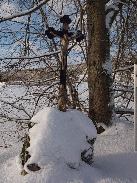 Seit vielen Jahrzehnten betreut und pflegt die Familie Sebastian und Magdalene Fischer das Bruckhof-Wegkreuz (1). Egal im Winter oder Sommer lädt das gusseiserne Wegkreuz mit den vergoldeten Figuren des gekreuzigten Jesus Christus und seiner Mutter Maria zu einer kurzen Verweildauer neben einem Lindenbaum Wanderer und Radfahrer ein.